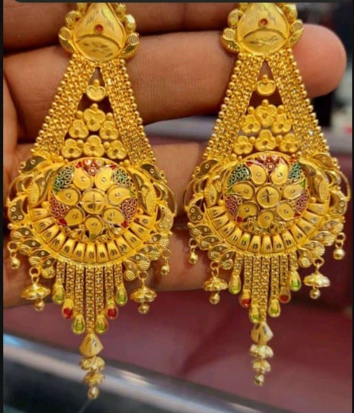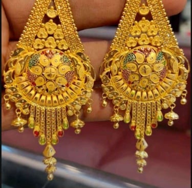 Elevate your traditional attire with these stunning gold Jhala Jhumka earrings. Expertly crafted with intricate detailing, these earrings showcase a beautiful blend of textures and patterns. The classic jhumka bell shape is adorned with delicate hanging chains ("jhala") that create graceful movement. Accents of vibrant enamel work add a touch of color and artistry to these timeless pieces, perfect for weddings, festivals, and special celebrations in Nepal.